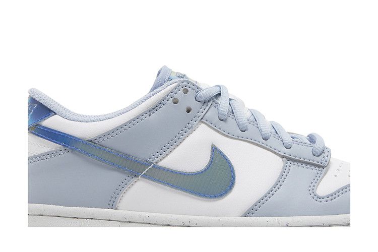 The Nike Dunk Low Next Nature Blue Whisper Iridescent (GS) features a white leather upper with light grey overlays and perforations for breathability. Blue to pearl white gradient iridescence accents...