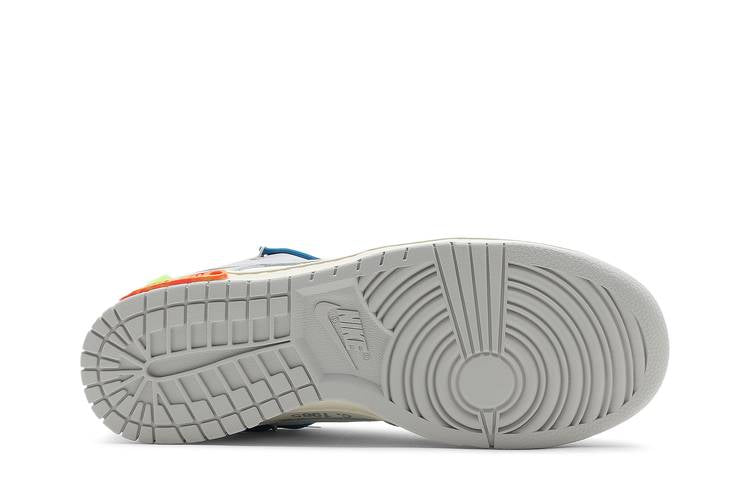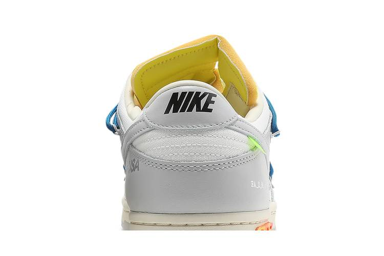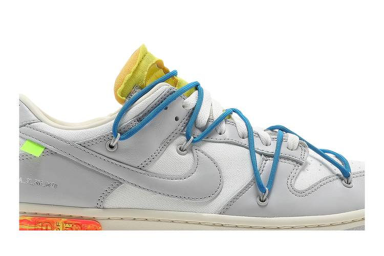 The Nike Dunk Low Off-White Lot 10 is part of the ‘Dear Summer’ collection, a continuation of Virgil Abloh’s collaboration with Nike. This sneaker boasts a white leather upper with grey canvas overlays, signature Off-White details like the plastic zip tie and printed text, and pops of color from the secondary lacing system and zip tie. Limited to fifty pairs, each shoe is marked with a ‘10 of 50’ badge on the midsole. The Nike Dunk Low Off-White Lot 10 offers a unique and stylish addition to any sneaker collection.