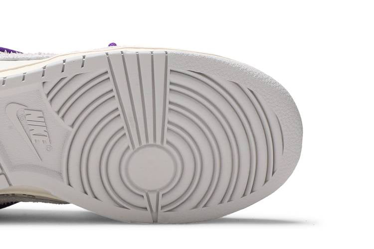 The Nike Dunk Low Off-White Lot 15 is a limited edition sneaker from the 'Dear Summer' collection by Virgil Abloh. Featuring a white leather upper with grey suede overlays, this low-top design includes signature Off-White details like a plastic zip tie, printed Helvetica text, and vibrant pops of color on the secondary lacing system. With only fifty pairs produced, each shoe is marked with a '15 of 50' badge on the lateral midsole. This exclusive collaboration combines style and uniqueness for sneaker enthusiasts.