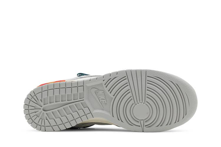 The Nike Dunk Low Off-White Lot 16 is part of the 'Dear Summer' collection by Virgil Abloh, following up on his initial collaboration with Nike in 2019. This low-top sneaker features a white leather upper with grey suede overlays, along with signature Off-White details like a plastic zip tie and printed Helvetica text. The shoe also includes contrasting accents in the form of a secondary lacing system, zip tie, exposed-foam tongue, and a unique rectangular tab on the Swoosh. Limited to just fifty pairs, each shoe is marked with a '16 of 50' badge on the lateral midsole.