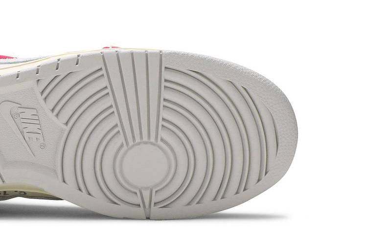 The Nike Dunk Low Off-White Lot 17 is part of the 'Dear Summer' collection by Virgil Abloh. It features a white leather upper with grey suede overlays, Off-White design elements...