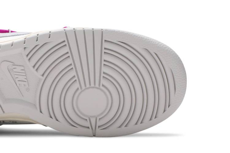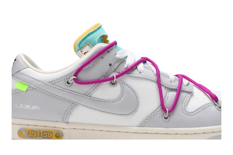 The Nike Dunk Low Off-White Lot 21 is a limited-edition sneaker from the ‘Dear Summer’ collection by Virgil Abloh. It features a white leather upper with grey canvas overlays, a plastic zip tie, and printed Helvetica text. The shoe also includes a secondary lacing system, zip-tie, exposed-foam tongue, and a rectangular tab on the Swoosh. Limited to fifty pairs, each shoe is marked with a ’21 of 50’ badge on the lateral midsole.