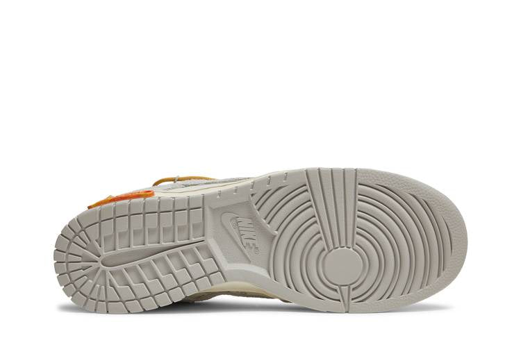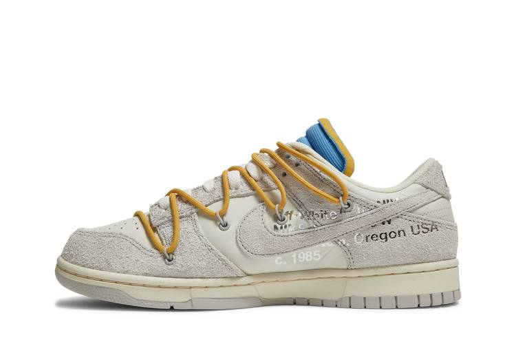 The Nike Dunk Low Off-White Lot 34 is a limited edition sneaker from the ‘Dear Summer’ collection by Virgil Abloh. It features a white leather upper with grey suede overlays, a plastic zip tie, printed Helvetica text, and colorful accents on the laces, zip tie, tongue, and Swoosh tab. Limited to fifty pairs, each shoe is marked with a ’34 of 50’ badge. Made of leather, suede, and rubber materials, this sneaker is a stylish addition to any collection.