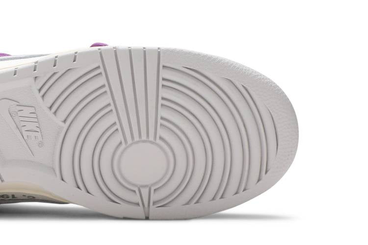 The Nike Dunk Low Off-White Lot 48 features a white leather upper with grey canvas overlays and signature Off-White design elements such as a plastic zip tie and printed Helvetica text. The shoe also includes pops of color on the secondary lacing system, zip tie, tongue, and Swoosh tab. Limited to fifty pairs, each shoe is marked with a '48 of 50' badge on the lateral midsole. The collaboration between Nike and Off-White designer Virgil Abloh offers a unique and stylish addition to any sneaker collection.