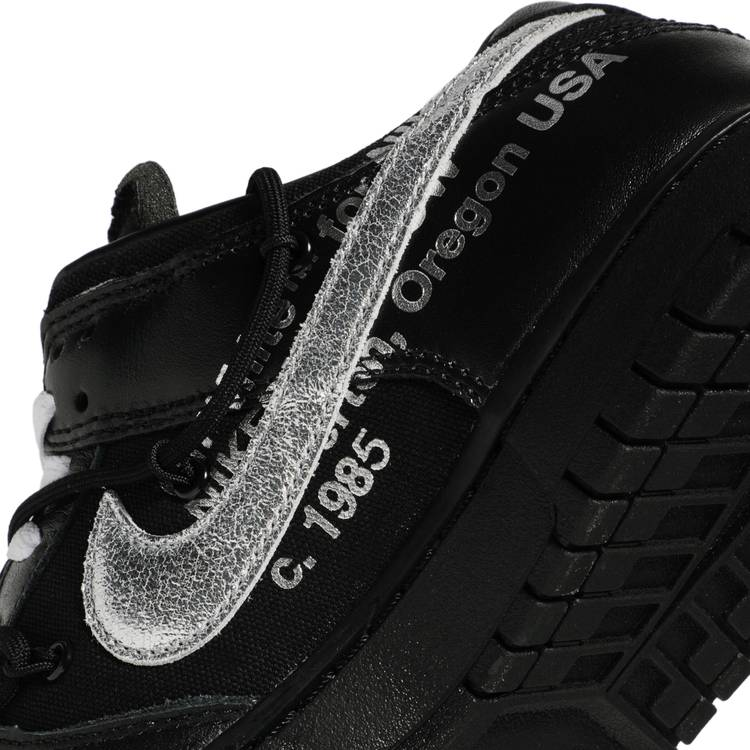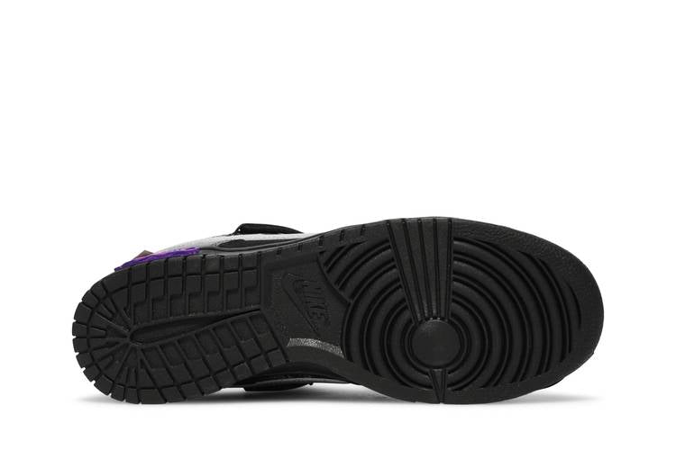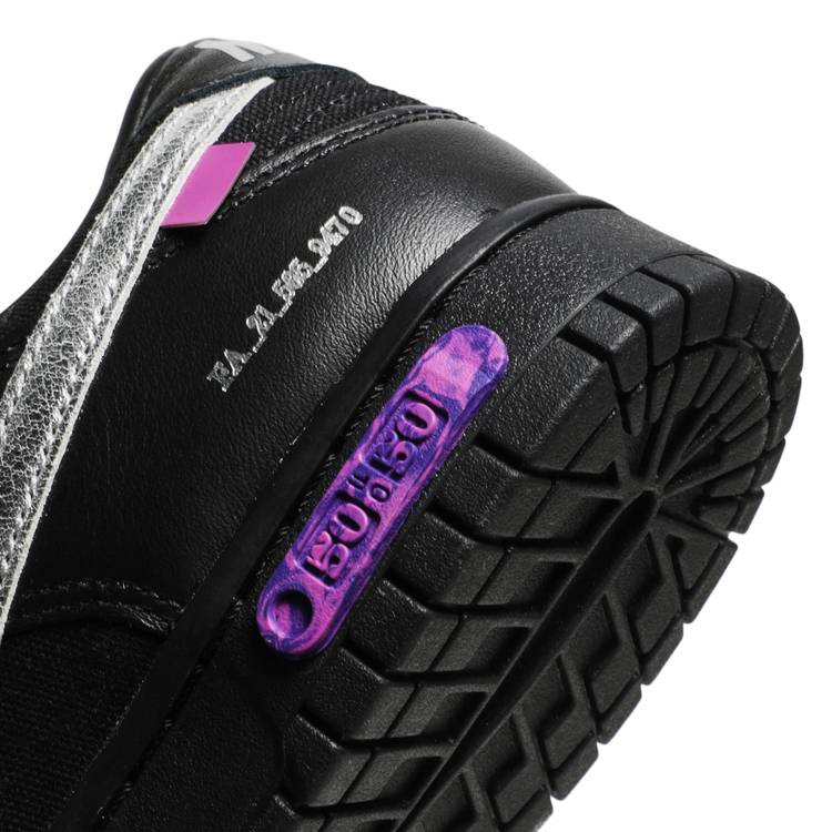 The Nike Dunk Low Off-White Lot 50 is the final release in the Off-White x Nike Dunk Low collection. Crafted with a black canvas upper and smooth leather overlays, this shoe features a metallic silver Swoosh and unique design elements like an exposed foam tongue and plastic zip tie. The design is completed with a black midsole featuring a purple "Lot 50 of 50" badge. Released in August 2021, this limited edition sneaker is a must-have for collectors.