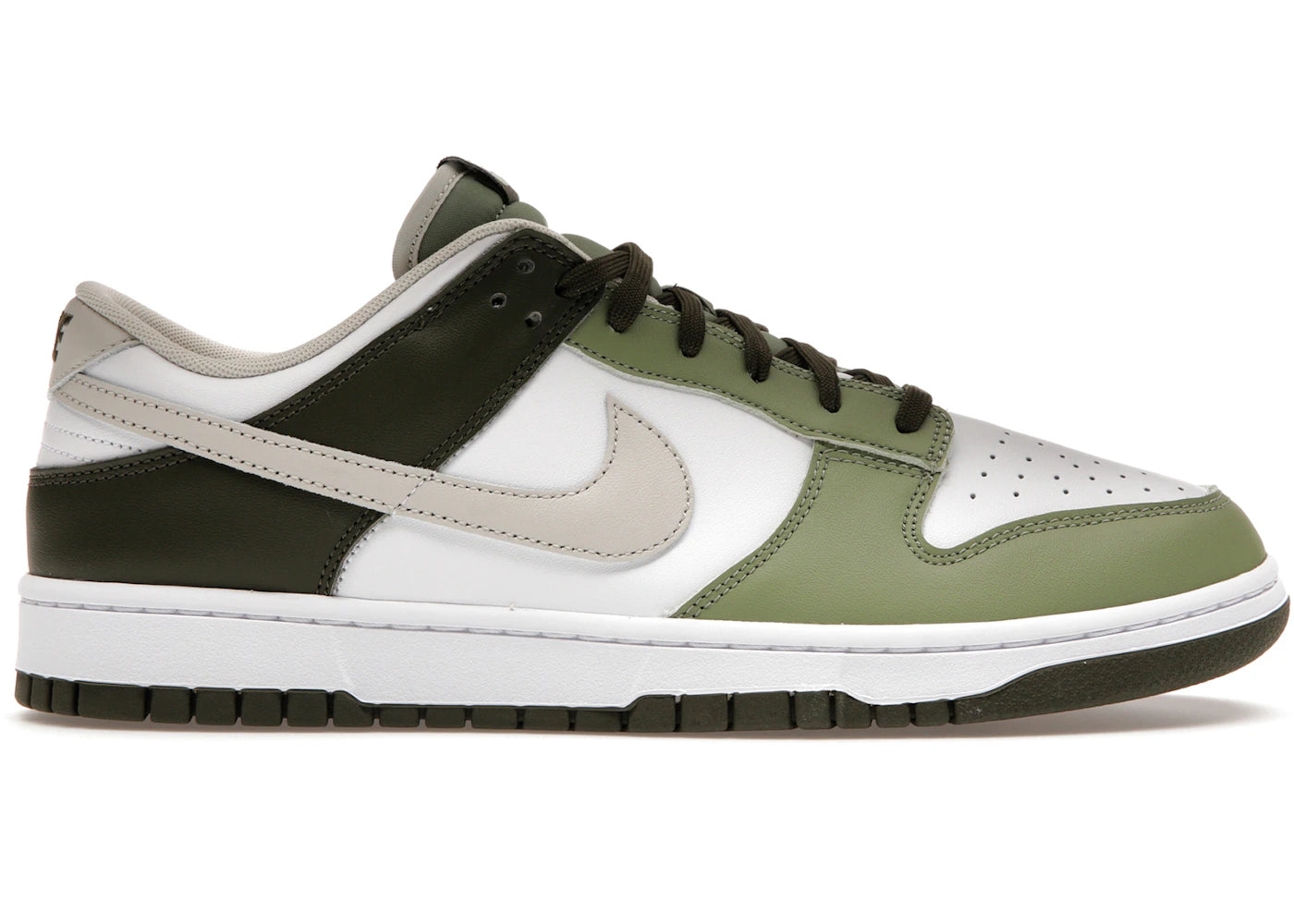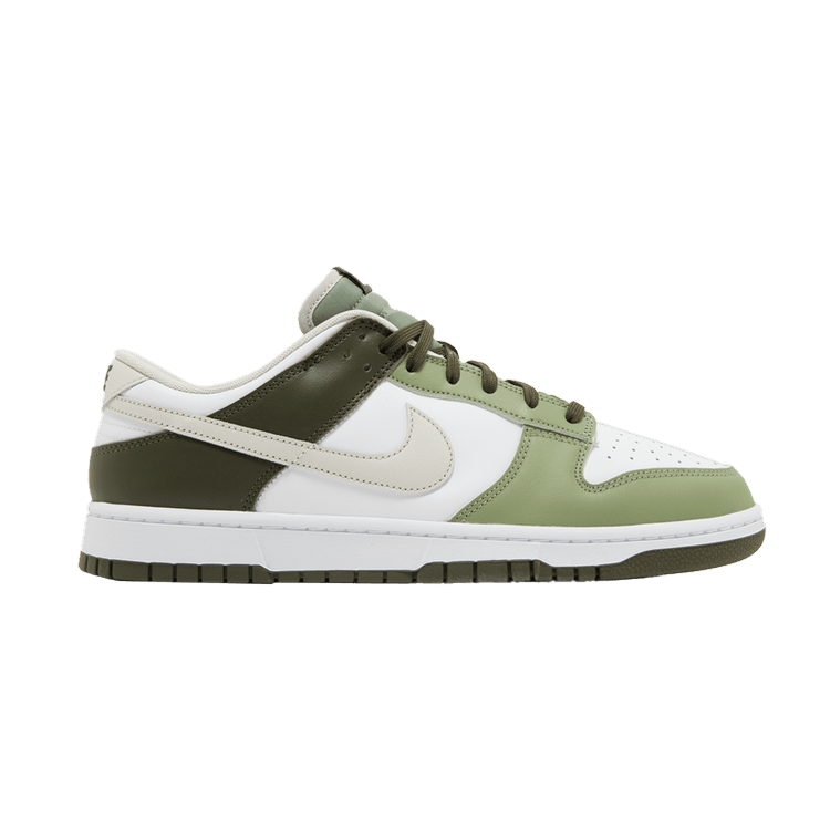The Nike Dunk Low Oil Green Cargo Khaki features a leather upper in white with Oil Green and Cargo Khaki overlays. Light Bone accents highlight the Swoosh, heel tab, and...