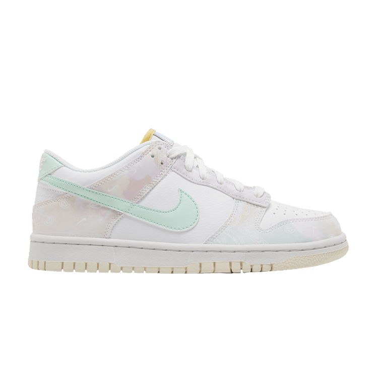 The Nike Dunk Low Pastel Paisley (GS) features a white leather base with perforated toe box for breathability. Overlays showcase a pastel paisley pattern across the toe, eyestays, and ankle...