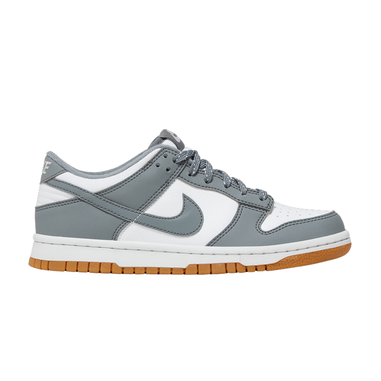 The Nike Dunk Low Reflective Swoosh White (GS) features a low-top design with reflective Swoosh logos and heel tab. The upper combines smooth Football Grey leather with white tumbled leather...