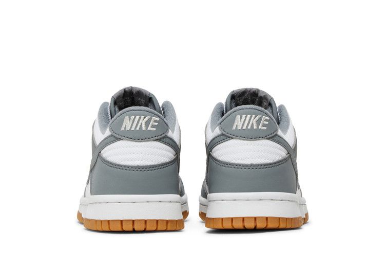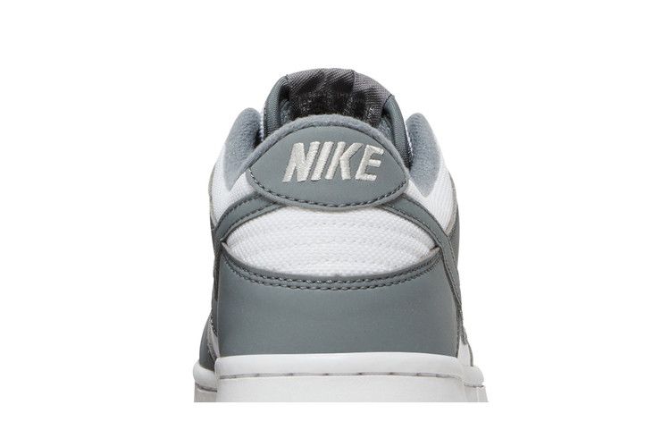 The Nike Dunk Low Reflective Swoosh White (GS) features a low-top design with reflective Swoosh logos and heel tab. The upper combines smooth Football Grey leather with white tumbled leather overlays. A semi-translucent Smoke Grey rubber outsole ensures grip.