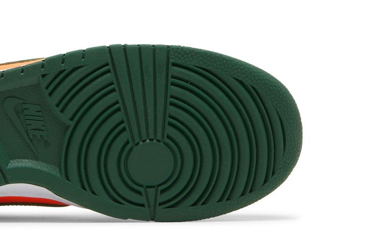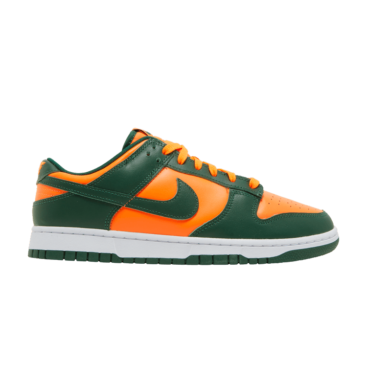 The Nike Dunk Low Retro Miami Hurricanes features orange and green, the University of Miami colors. It has a leather upper with an orange base and green overlays. The laces...