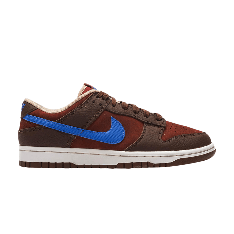 The Nike Dunk Low Retro PRM Mars Stone has a maroon suede base with perforated toe box. Brown tumbled leather overlays pair with an electric blue textile Swoosh. The upper...