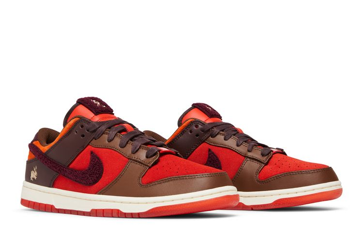 The Nike Dunk Low Retro PRM Year of the Rabbit Light Crimson (2023) is part of the ‘Year of the Rabbit’ pack, paying tribute to the lunar new year. This low-top sneaker sports an orange suede upper complemented by brown leather overlays and a chenille Swoosh. The design includes a rabbit graphic on the lateral heel and Chinese characters on the chenille tongue tag, translating to ‘rabbit.’ The shoe is constructed on a traditional cupsole with off-white sidewalls and a red semi-translucent rubber outsole.