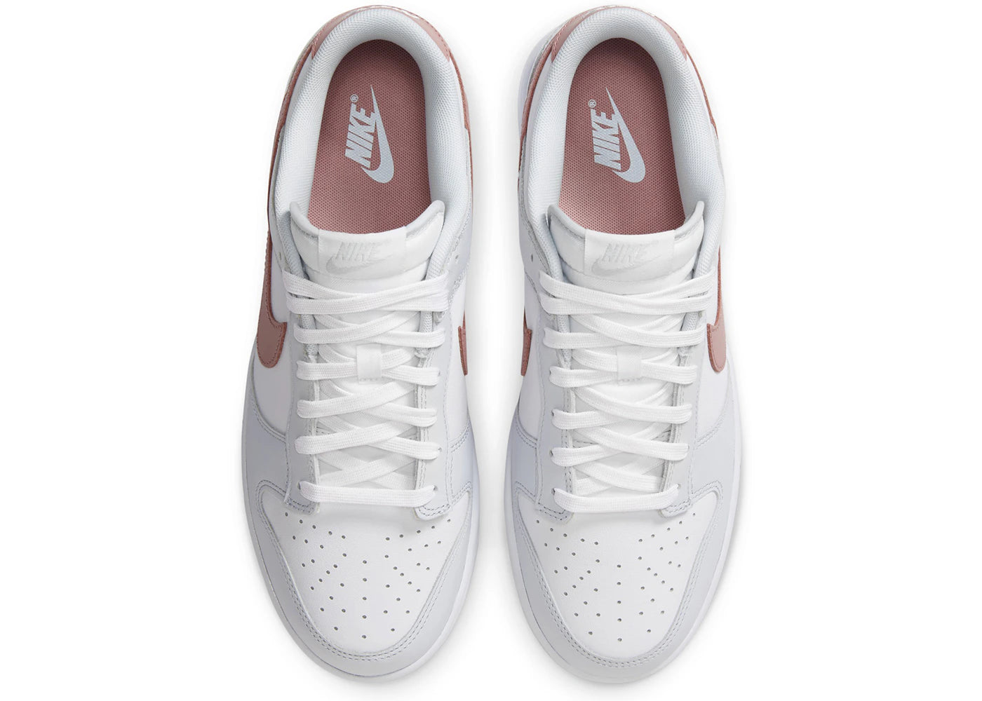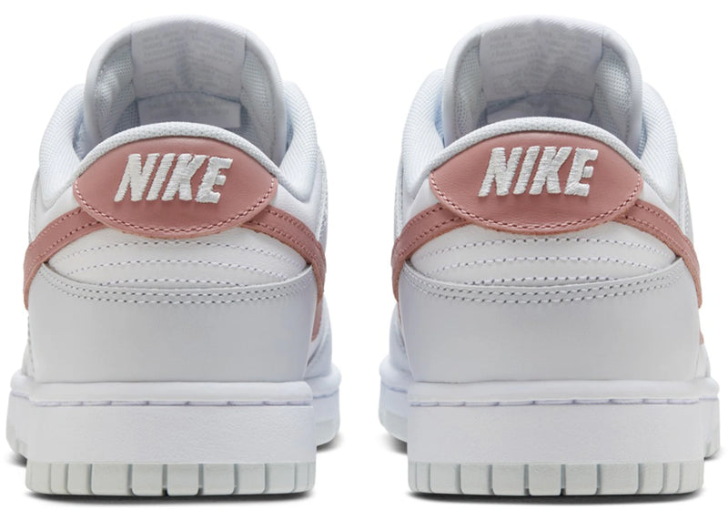 The Nike Dunk Low Retro Red Stardust Pure Platinum features a white leather upper with platinum cross-straps and Stardust Red accents on the heel lip and Swoosh. It includes a grippy rubber sole with pivot circles for traction and a foam midsole for cushioning.