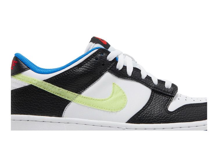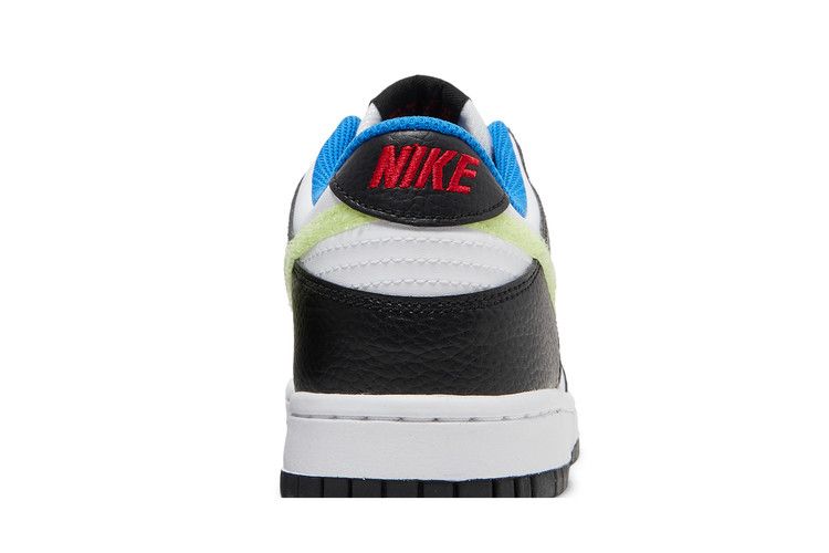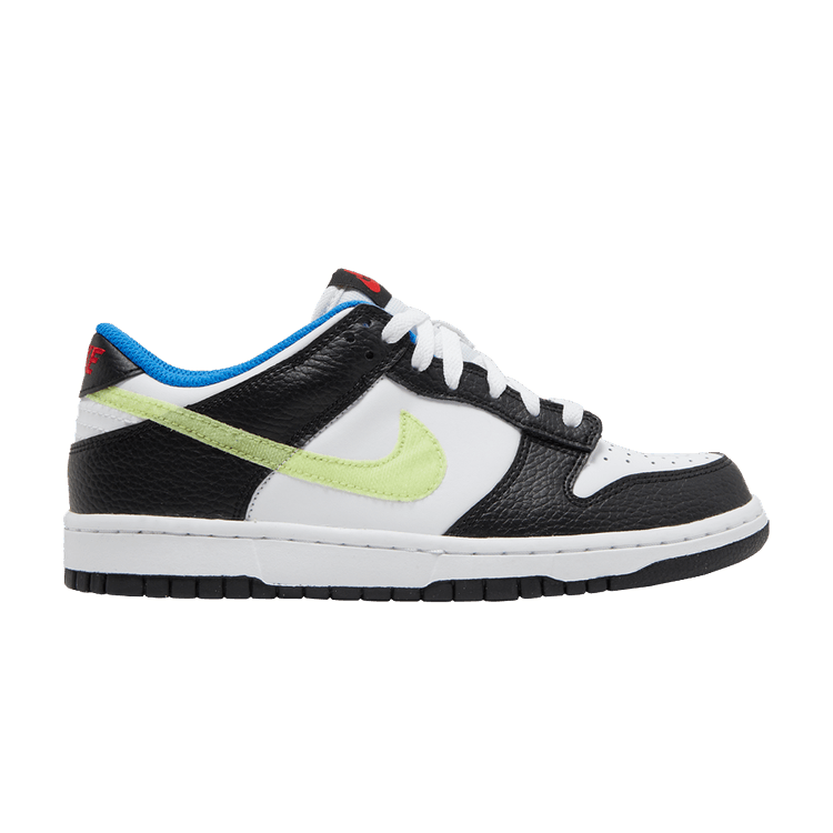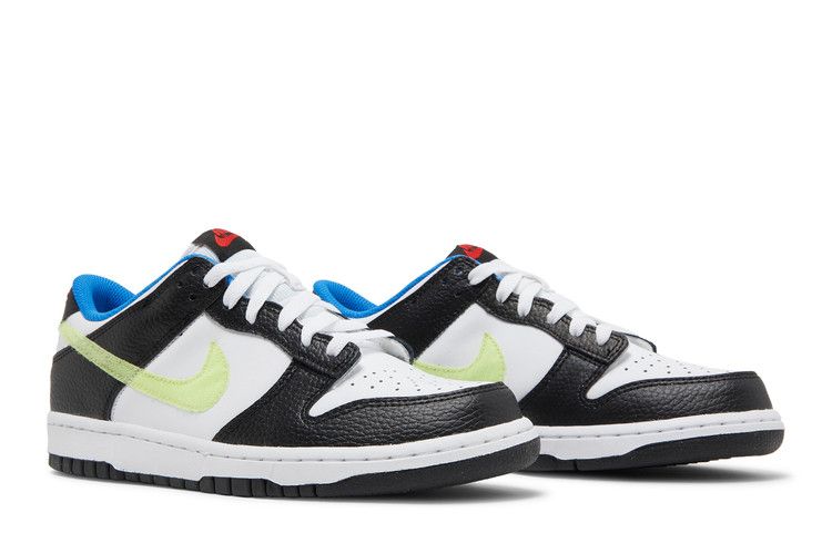 The Nike Dunk Low Signal Blue Lemon Twist GS has a white leather upper with black overlays and a Light Lemon Twist side Swoosh. The tongue includes red Nike branding,...