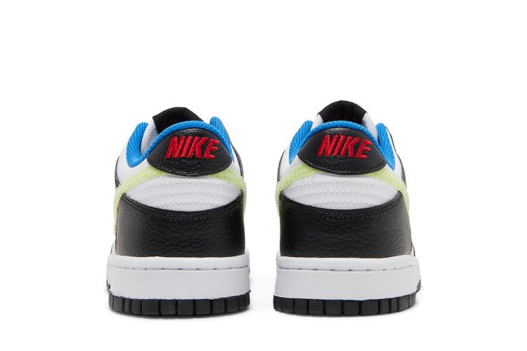 The Nike Dunk Low Signal Blue Lemon Twist GS has a white leather upper with black overlays and a Light Lemon Twist side Swoosh. The tongue includes red Nike branding, while the heel features perforations for breathability. A padded collar, white rubber midsole, and treaded black outsole provide comfort and traction.