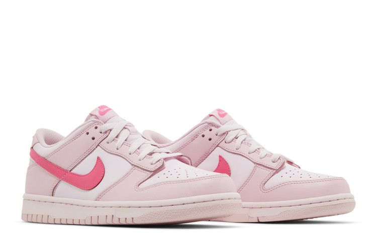 The Nike Dunk Low Triple Pink (GS) features a leather upper in light pink with hot pink accents on the Swoosh, tongue tag, and heel. The shoe is completed with a breathable nylon tongue and rubber outsole for durability. This Grade School sizing shoe was inspired by the classic retro Nike basketball style.