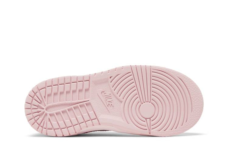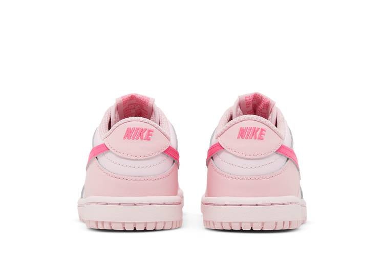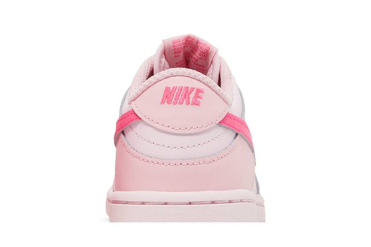 The Nike Dunk Low Triple Pink (TD) features a combination of dark and light pink leather upper with a pink Nike Swoosh. The perforated toe box and heel counter are in a lighter shade of pink, made of synthetic leather from recycled polyester. The rubber outsole and midsole are also in light pink hues. This toddler shoe was released on January 1, 2022.