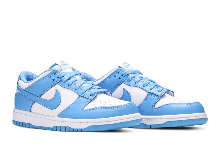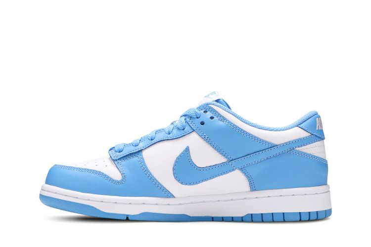 The Nike Dunk Low UNC (2021/2024) (GS) is a leather sneaker designed for big kids, featuring a color-blocked design inspired by collegiate basketball. The shoe has a white base with University Blue overlays on the eyestay, Swoosh, and heel and forefoot overlays. Classic Nike branding is present on the tongue tag and heel tag. The durable rubber cupsole provides stability, with an outsole offering traction for performance. Available in Grade School sizing, this Nike Dunk Low UNC 2021 (GS) is a timeless addition to any sneaker collection.
