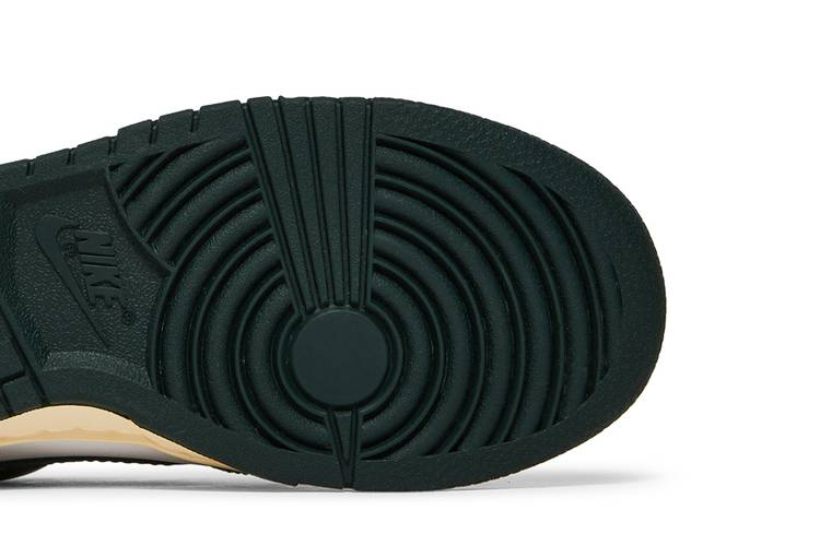 The Nike Dunk Low Vintage Green (Women's) features an aged aesthetic with a pre-yellowed rubber midsole and cream-colored laces. The upper is crafted from smooth white leather with contrasting hits of green on the Swoosh, eyestay, and overlays. The design pays homage to the '80s hoops shoes with its retro color scheme. The nylon tongue displays classic Nike branding, completing the vintage look. Made with Pro Green and white leather, this shoe offers a classic two-tone color blocking seen in the original line of Nike Dunks from 1985.