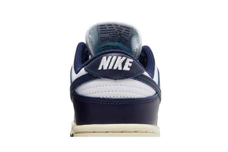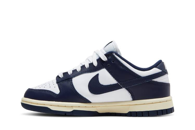 The Nike Dunk Low Vintage Navy (Women's) is a retro-inspired shoe that draws inspiration from the original 'Be True to Your School' series of 1985. This sneaker features a low-cut design with a pre-yellowed rubber midsole for a vintage aesthetic. The white leather upper is complemented by navy overlays and Swooshes, creating a classic two-tone look. Additional details include woven Nike tongue labels and an embroidered Nike heel patch, adding to the overall retro charm of the shoe.