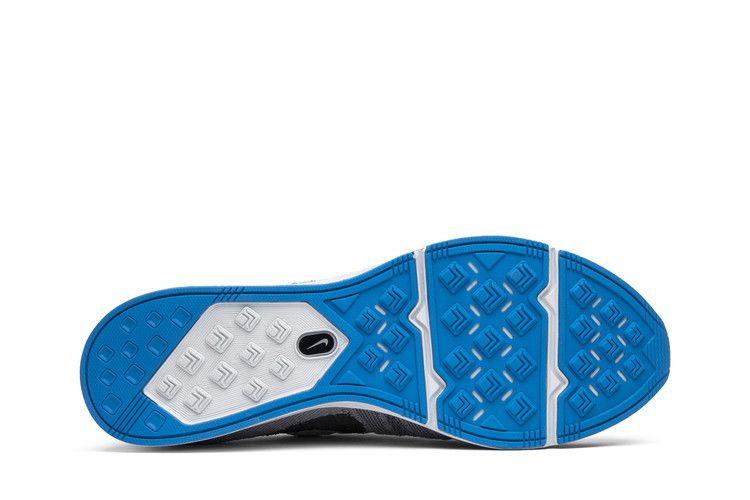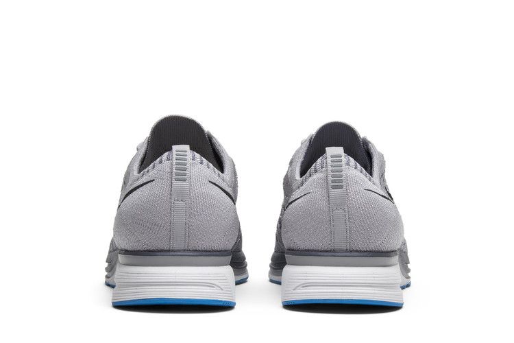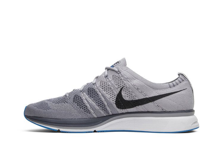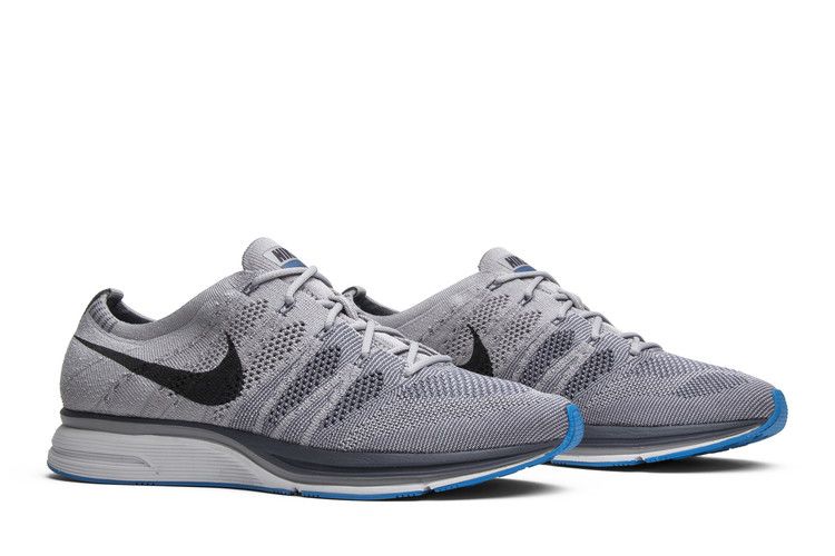 The Nike Flyknit Trainer Atmosphere Grey features a Flyknit upper in Atmosphere Grey, Thunder Grey, and Vast Grey with bright-blue accents. The toe box and sides have larger perforations for...