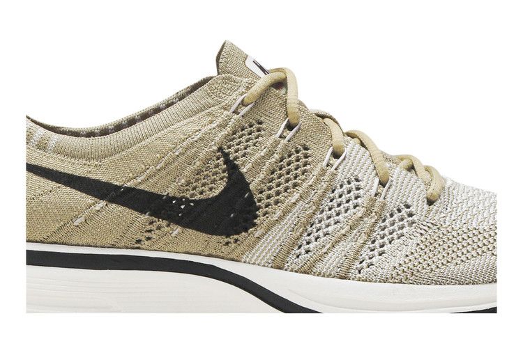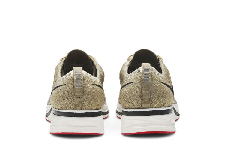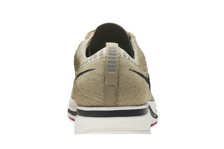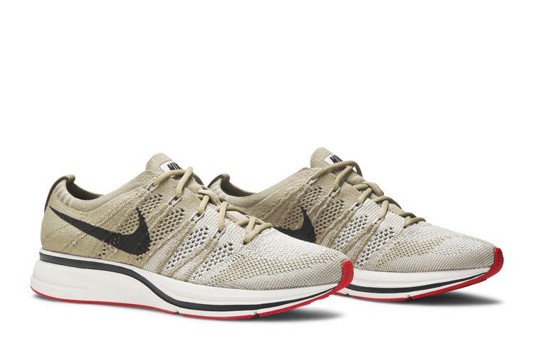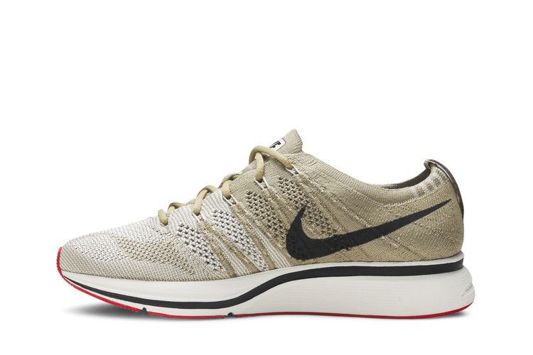 The Nike Flyknit Trainer Neutral Olive has a seamless Flyknit upper in neutral olive, velvet brown, and sail. The low-top design includes tonal Flywire mesh, black Swooshes, and a waffle-pattern rubber outsole. Red accents and a branded tongue patch complete the look.