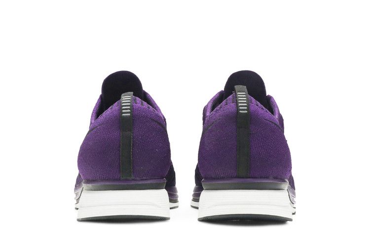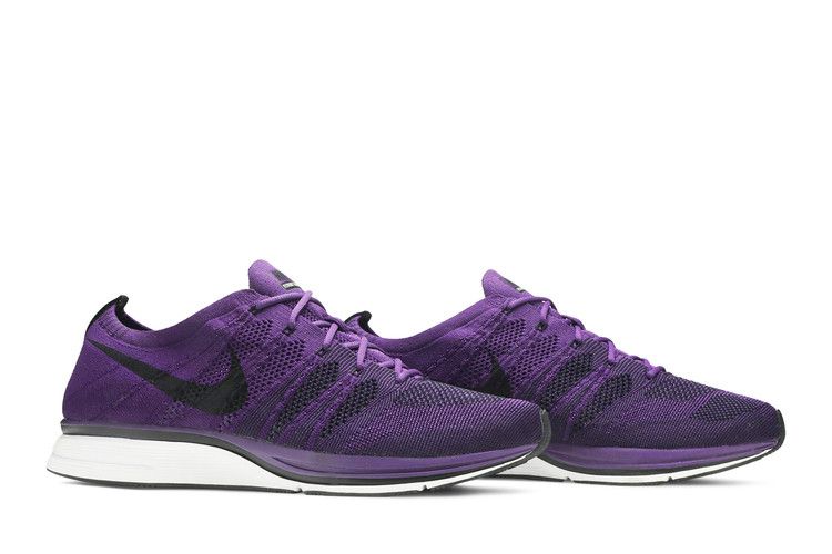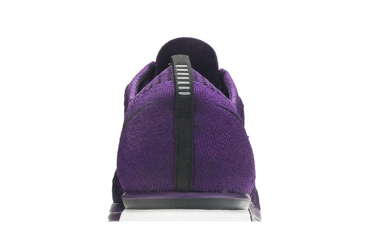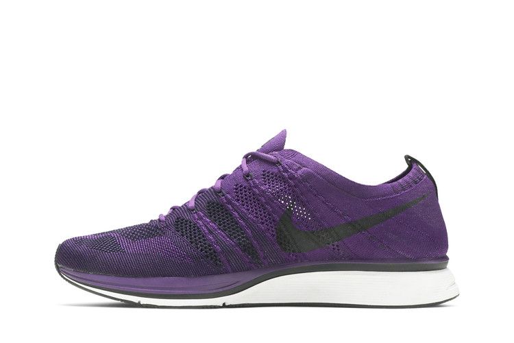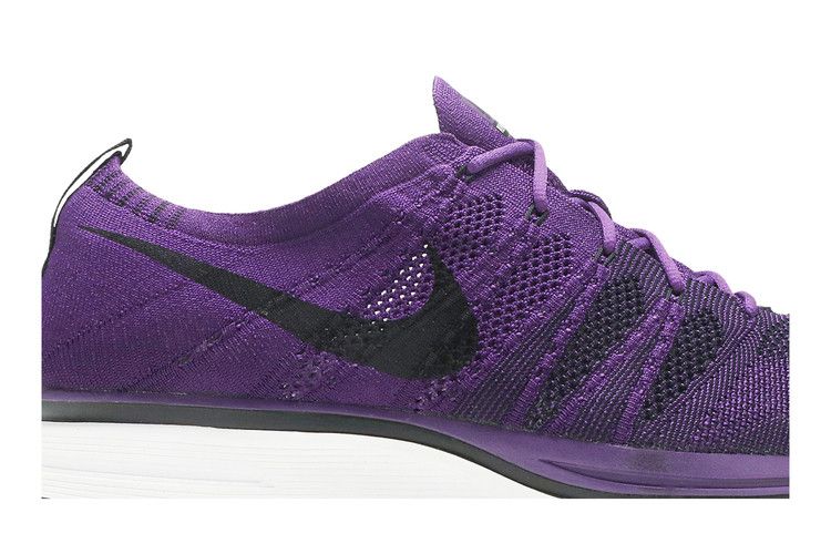 The Nike Flyknit Trainer Night Purple features a breathable Flyknit upper in Night Purple, with a unique knit pattern for each section. Flywire cables provide side stabilization, while an elastic ankle collar ensures a sock-like fit. The design includes a black Nike Swoosh, branded tongue, and pull tab at the heel. A white rubber midsole and black outsole complete the silhouette.