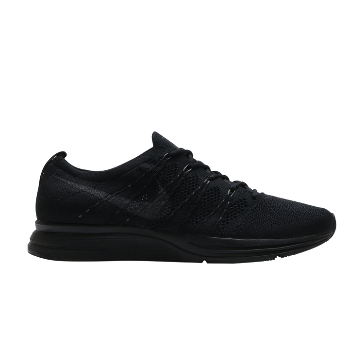 The Nike FlyKnit Trainer Triple Black features a full-length foam midsole for shock absorption and cushioning. The rubber-pod outsole ensures traction on various surfaces. Its all-black design includes matching Swooshes and laces. The lightweight FlyKnit upper offers a breathable, sock-like fit with seamless construction for natural movement. Released on February 23, 2018, the Nike FlyKnit Trainer Triple Black is available now at Side Kicks.