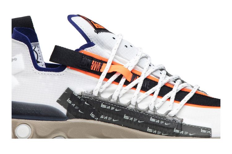 The Nike ISPA React Low Summit White features a low-top design with a breathable mesh upper in white, accented by a black and orange stripe. The outsole contrasts in khaki,...