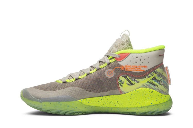 The Nike KD 12 90s Kid combines metallic silver, yellow, and white in a vibrant colorway inspired by Kevin Durant's childhood. The mesh upper features graffiti-inspired detailing on the heel, while four-way Flywire cables provide stability. A Zoom Air unit under the sockliner delivers responsive cushioning.
