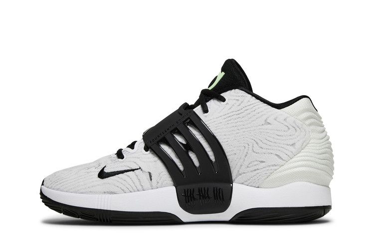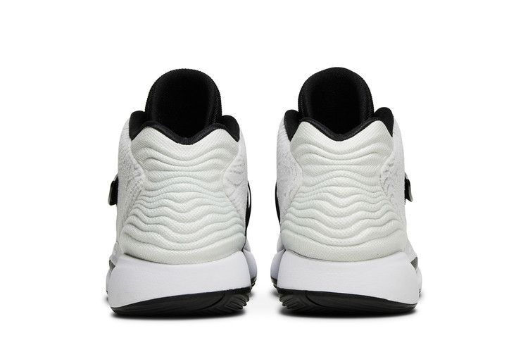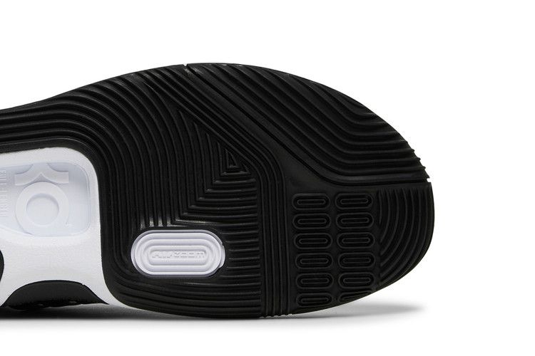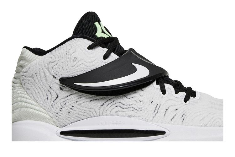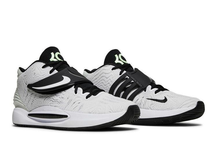 The Nike KD 14 TB Black White Volt features a black and white upper with volt accents for high visibility. It includes a supportive strap and responsive cushioning for stability...