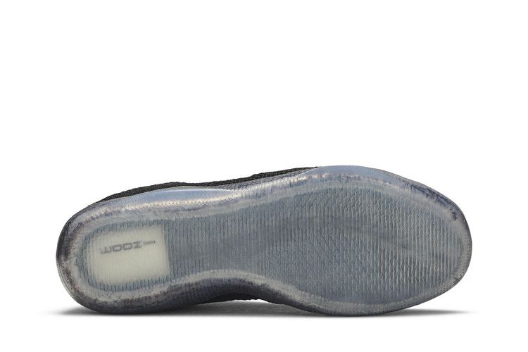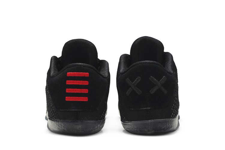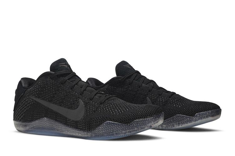 The Nike Kobe 11 Elite Low Black Space features a low-top design with an all-black Flyknit upper for lightweight breathability. Reflective black Swoosh branding and suede panels on the tongue and heel add contrast. One shoe displays Kobe’s "Achilles" logo in red, while the other has "XX" embroidery. The ice-blue translucent sole provides a bold finish.