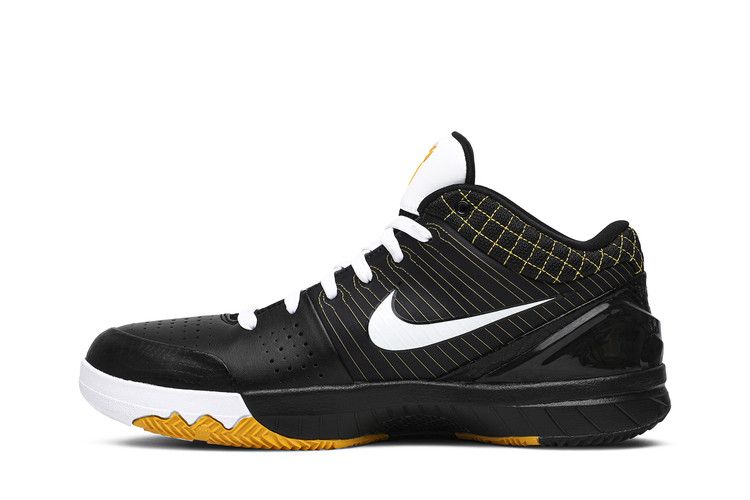 The Kobe 4 Protro White Black Del Sol features a white upper with black and yellow accents. It includes a black Nike Swoosh outlined in yellow, a white midsole with...