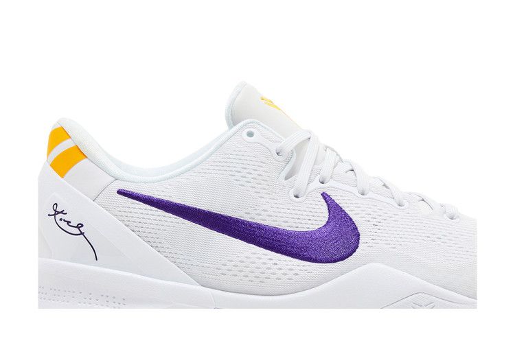 The Nike Kobe 8 Protro Lakers Home features a white engineered mesh upper with a purple embroidered Swoosh and gold signature heel detailing. The lightweight design includes responsive cushioning and...