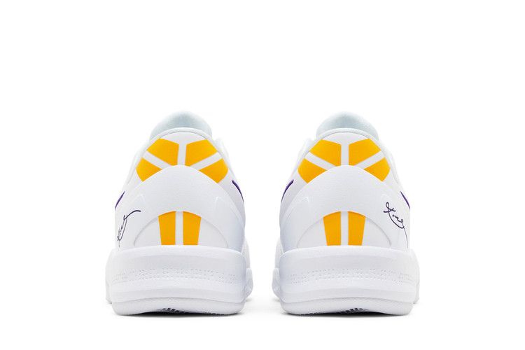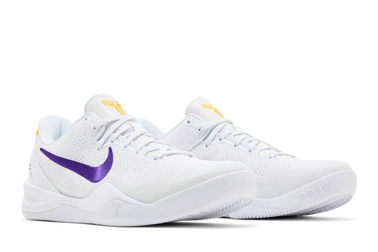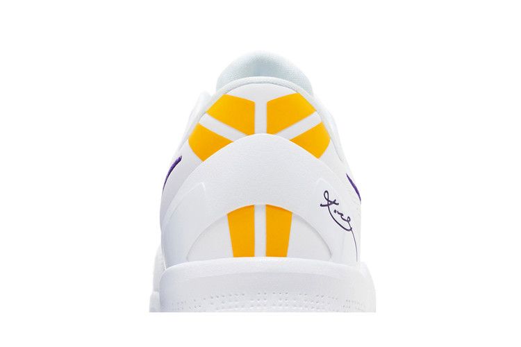 The Nike Kobe 8 Protro Lakers Home features a white engineered mesh upper with a purple embroidered Swoosh and gold signature heel detailing. The lightweight design includes responsive cushioning and durable materials for on-court performance. Gold Kobe logos on the tongue and heel complete the Lakers-inspired colorway.