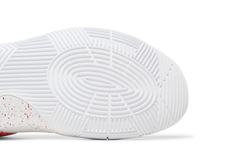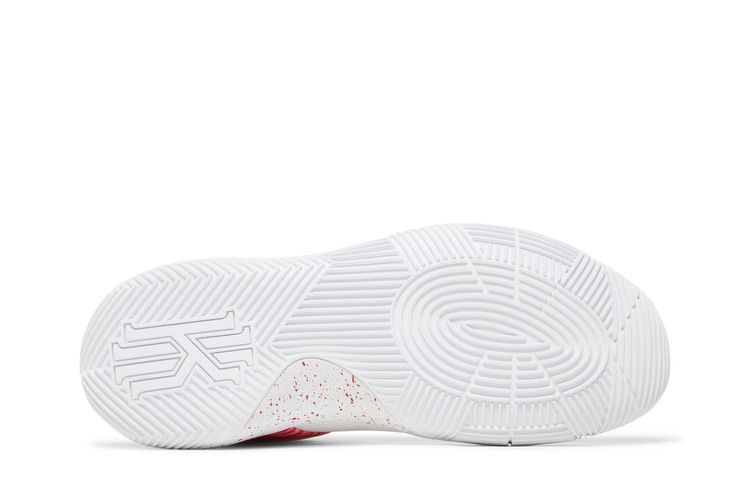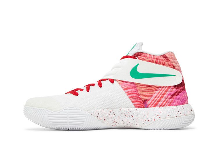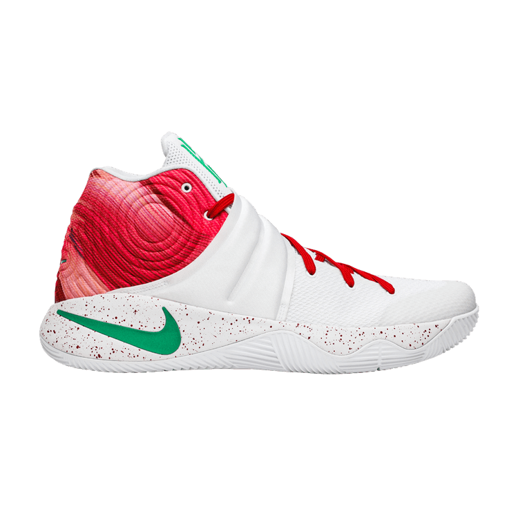The Nike Kyrie 2 Ky-Rispy Kreme (Special Box Version 2) (Not Windowed) features a red and white colorway with green accents. The upper combines lightweight mesh with a glossy red textured finish and a white toe section. The white midsole includes a speckled red pattern for added detail.