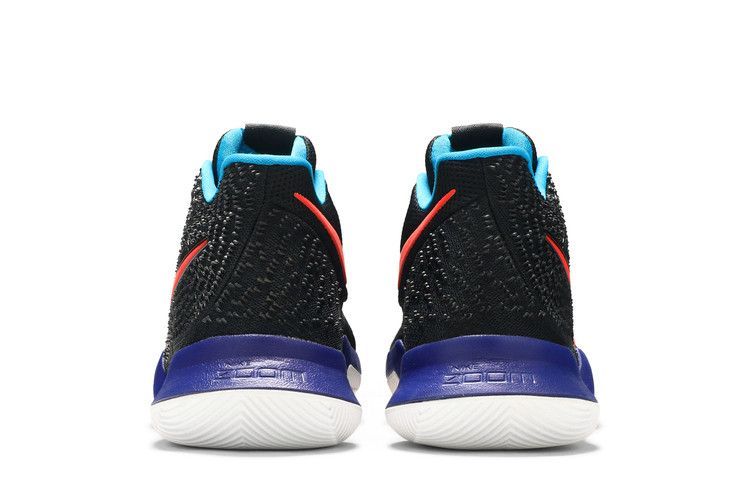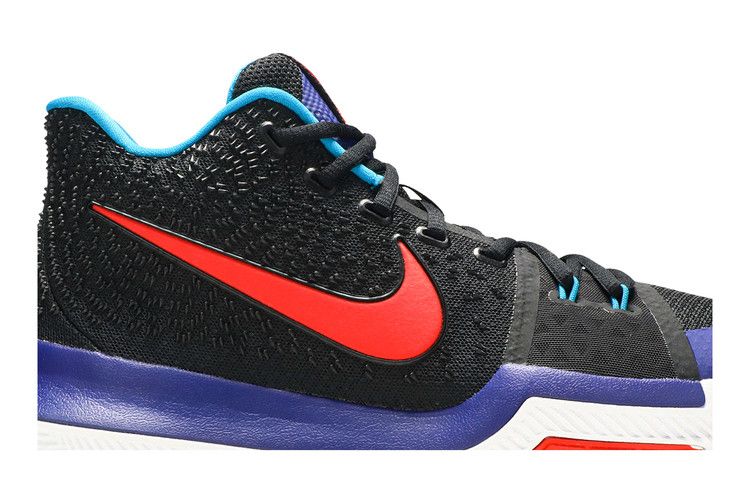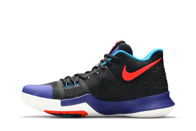 The Nike Kyrie 3 Kyrache Light draws inspiration from the classic Nike Huarache line, blending retro aesthetics with modern performance. Its black, team orange, concord, and neo turquoise colorway reflects a '90s-inspired design. The shoe features responsive cushioning and multidirectional traction for quick movements on the court.