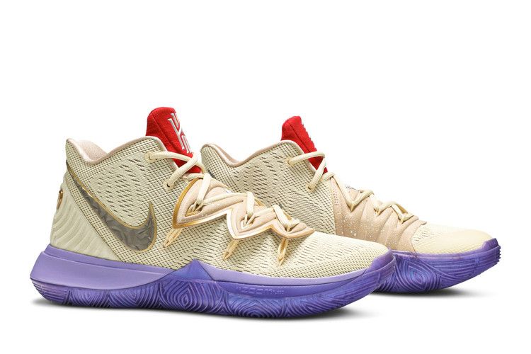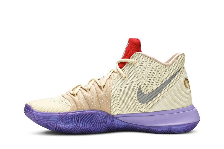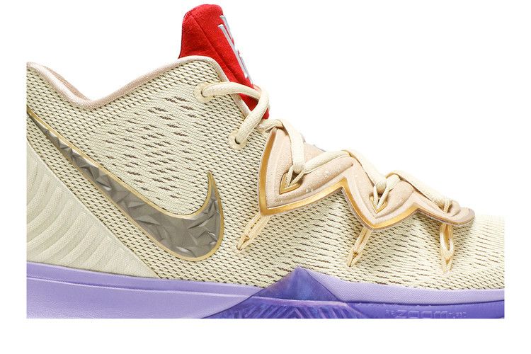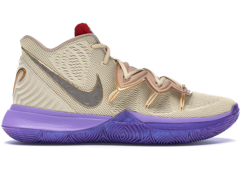 The Kyrie 5 Concepts Ikhet features a beige upper with a grey Nike Swoosh, purple midsole, and matching sole. Designed for both performance and casual wear, it combines functionality with a clean color scheme. Released on December 2018, the Kyrie 5 Concepts Ikhet is available now at Side Kicks.