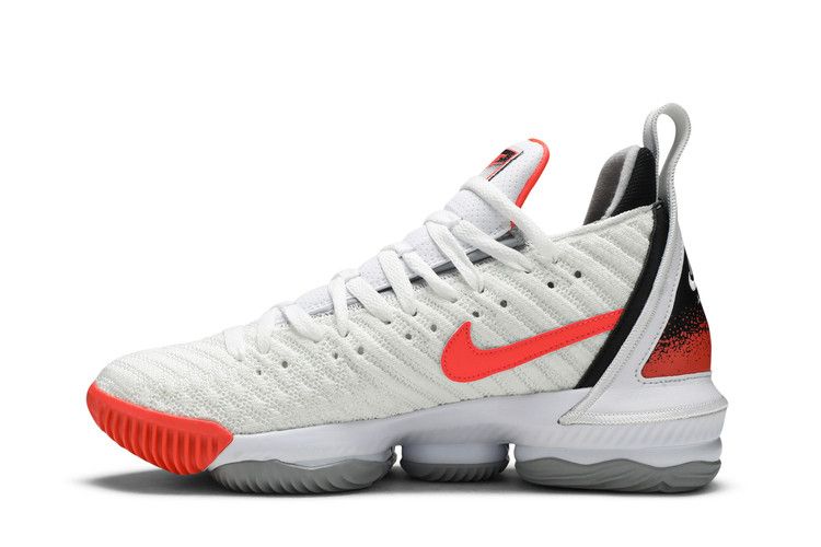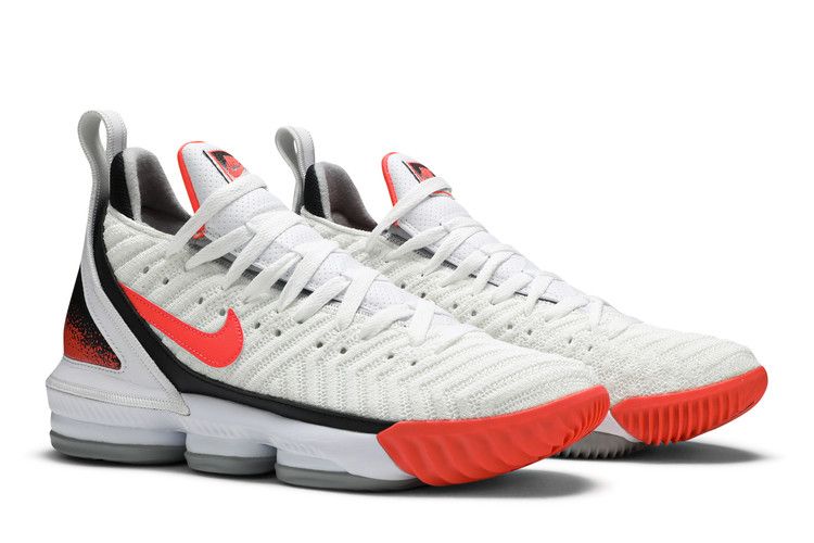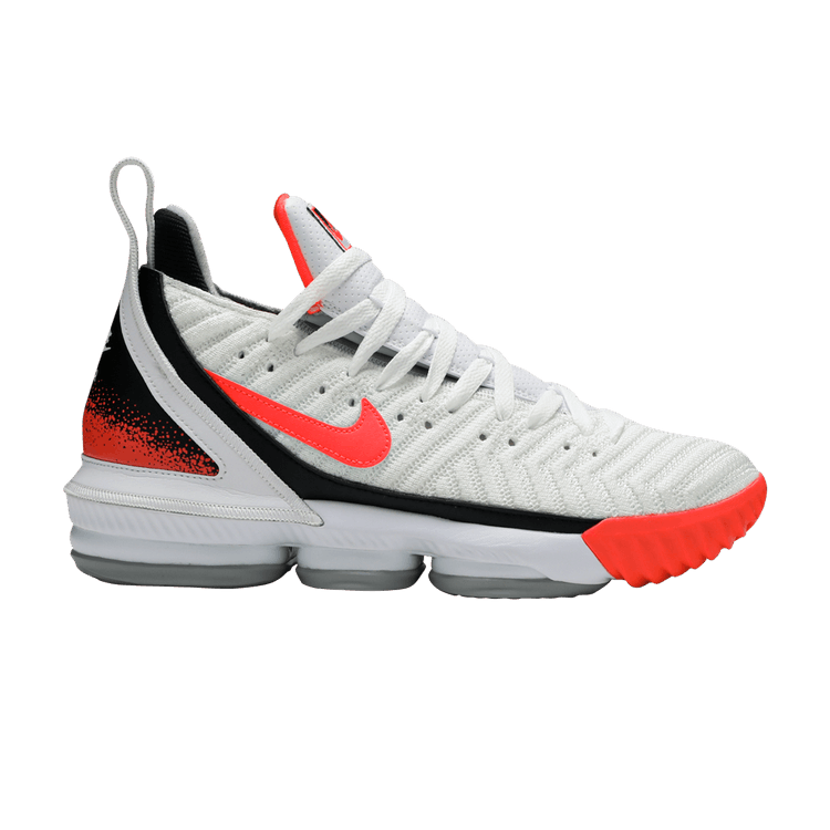 The LeBron 16 Black Hot Lava features a black upper with red and white accents, including a red Nike Swoosh. It has a black midsole with white detailing and a...