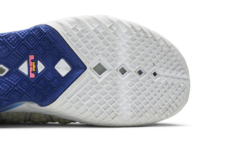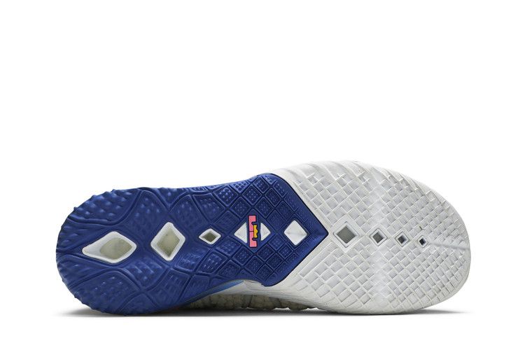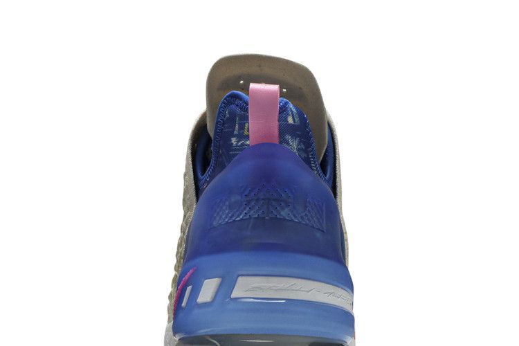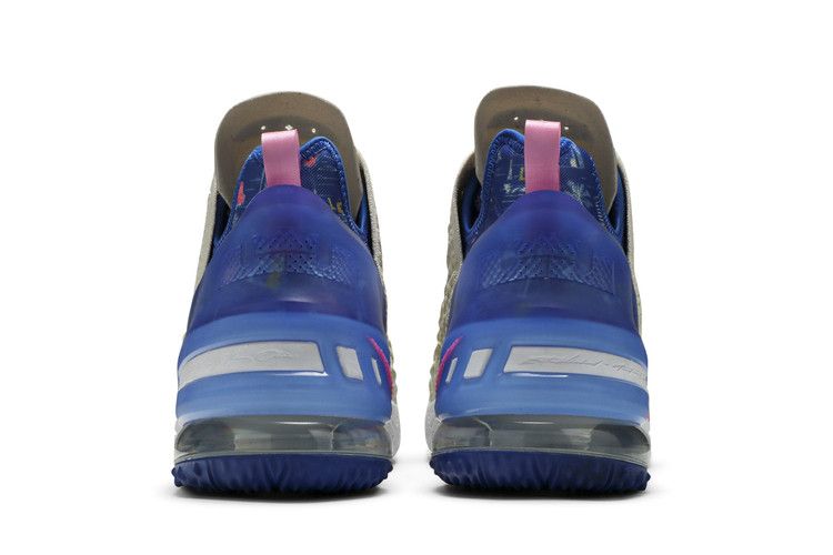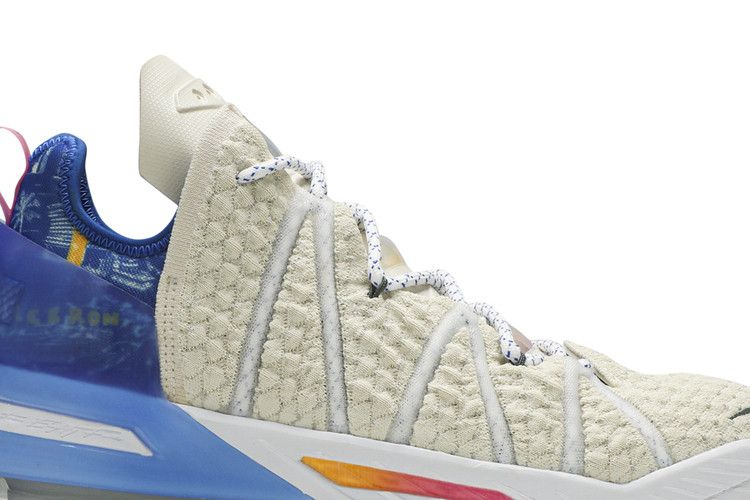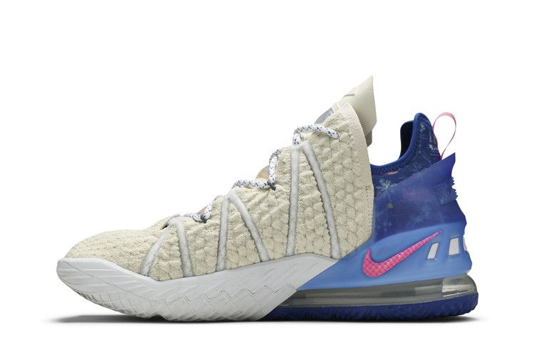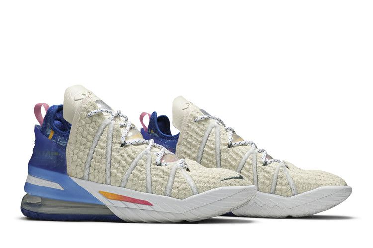 The Nike LeBron 18 Los Angeles By Day features a KnitPosite 2.0 upper with a white front and blue heel. It includes full-length Zoom Air in the midsole and Max...