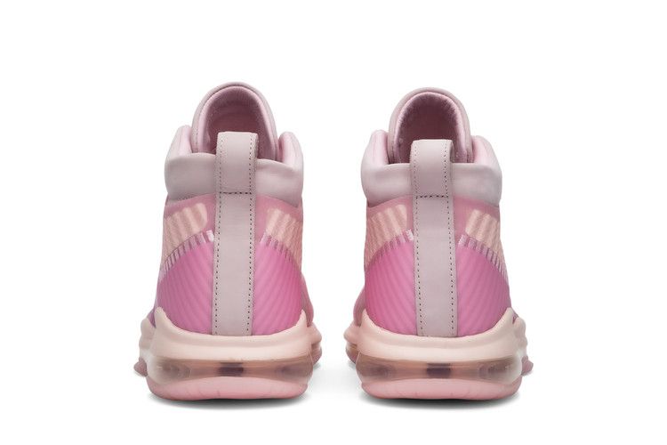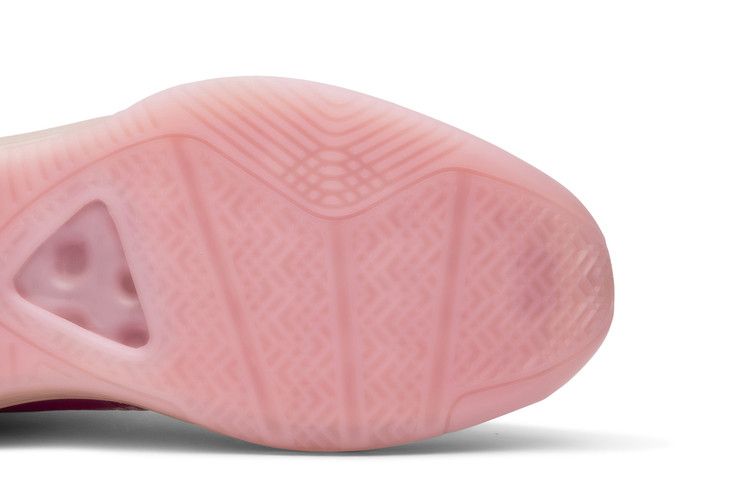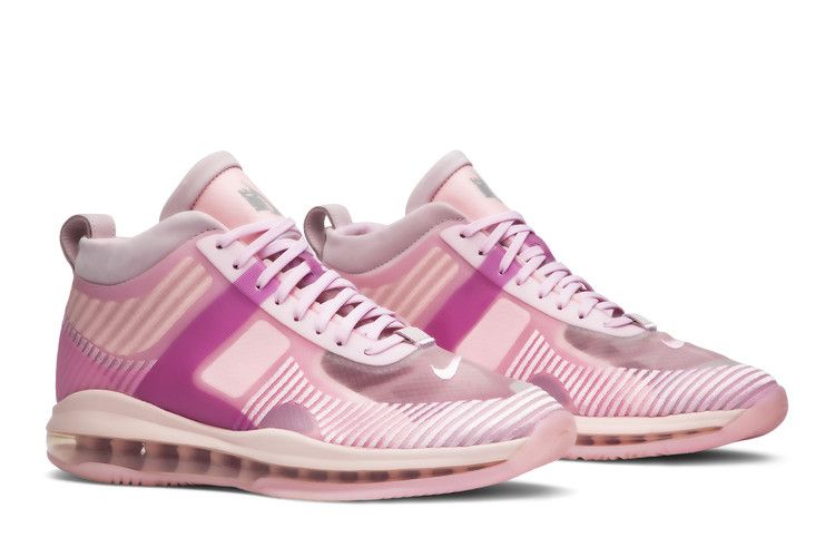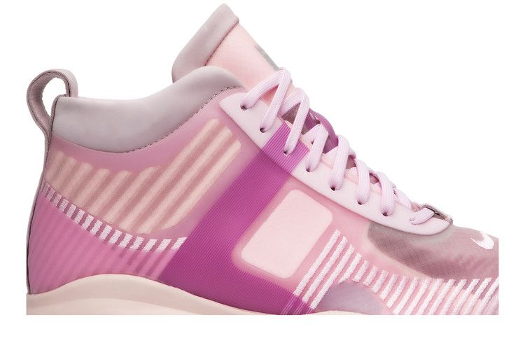 The Nike LeBron Icon John Elliot Tulip Pink features transparent TPE yarn layered with shades of pink and fuchsia on the laces for a textured look. A stitched stripe design...