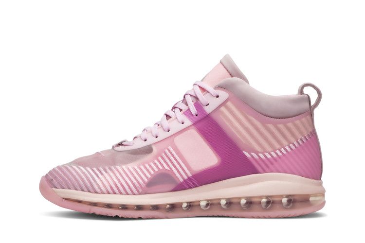 The Nike LeBron Icon John Elliot Tulip Pink features transparent TPE yarn layered with shades of pink and fuchsia on the laces for a textured look. A stitched stripe design wraps the toebox and heel, while minimal branding includes a tongue text insignia and small Swoosh. The pink outsole pairs with LeBron 8-inspired Air Max cushioning, and a soft pink leather sock liner adds refinement. Full-length Air Max midsoles and translucent rubber outsoles complete the monochromatic theme.