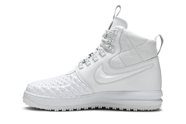 The Nike Lunar Force 1 Duckboot Winter White features a high-top design with a pristine all-white finish. It includes a puff-jacket-like ankle material, oversized tongue, and heel tag for added warmth. The diamond-studded toe box and metal hardware eyelets enhance durability, while the Lunarlon midsole provides cushioning.
