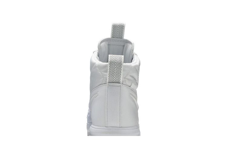 The Nike Lunar Force 1 Duckboot Winter White features a high-top design with a pristine all-white finish. It includes a puff-jacket-like ankle material, oversized tongue, and heel tag for added...