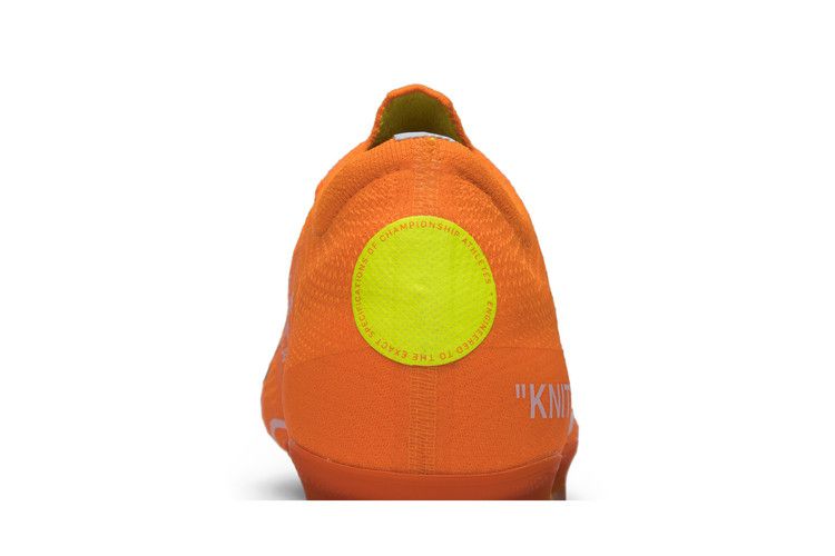 The Nike Mercurial Vapor 360 Off-White is a collaborative football cleat designed by Virgil Abloh and Nike. It features a Flyknit upper in orange with a micro-textured finish, reinforced by a transparent mudguard strip. The asymmetrical design includes mismatched imprints, a white Swoosh with text on the lateral side, and contrasting blue and orange laces. The heel displays a yellow circle with "KNIT" branding. Released on March 31, 2018, the Nike Mercurial Vapor 360 Off-White is available now at Side Kicks.
