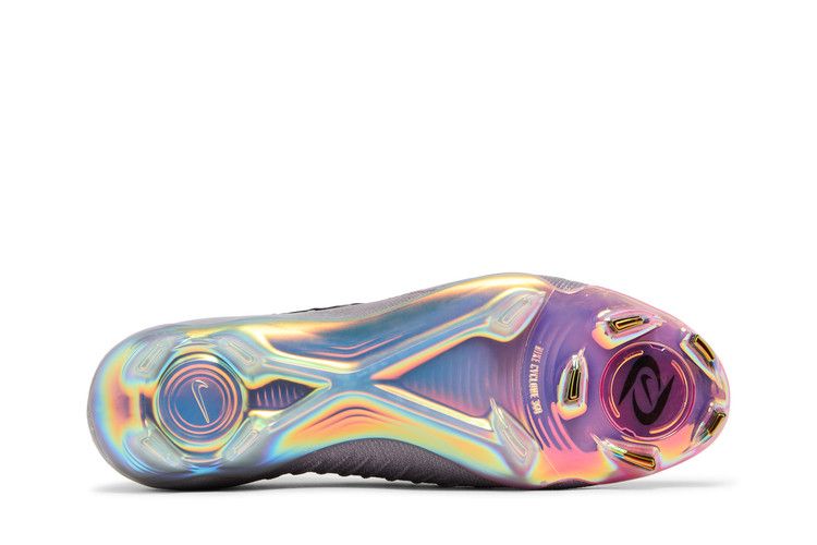 The Nike Phantom GX 2 Elite AS FG Low Rising Gem Pack is a low-top soccer cleat designed for soft ground surfaces. The upper features an Atmosphere Grey finish with a textured surface for improved ball control. Angled laces and subtle branding, including a small Swoosh near the laces and an inverted Swoosh on the inner heel, complete the design. The iridescent outsole plate blends blue, white, purple, and pink hues. Released on May 5, 2024, the Nike Phantom GX 2 Elite AS FG Low Rising Gem Pack is available now at Side Kicks.