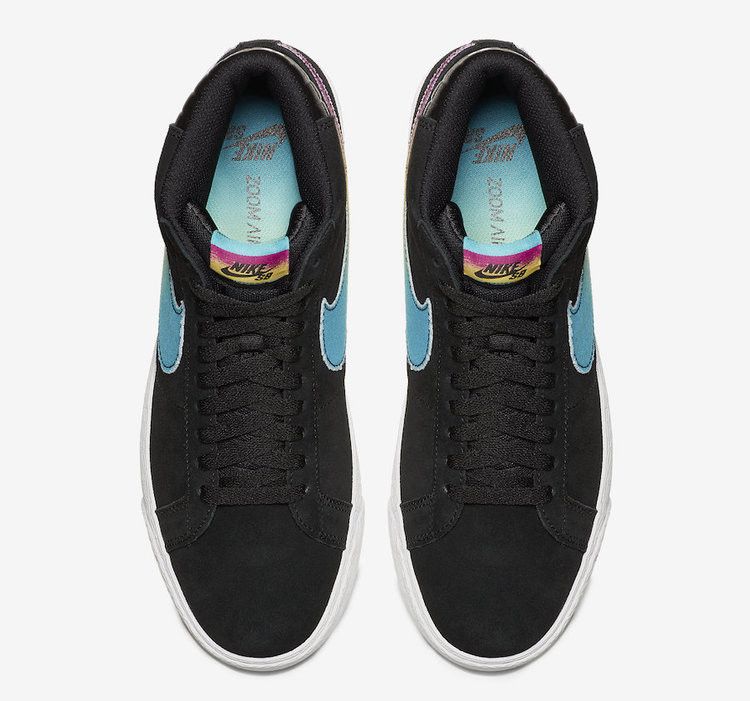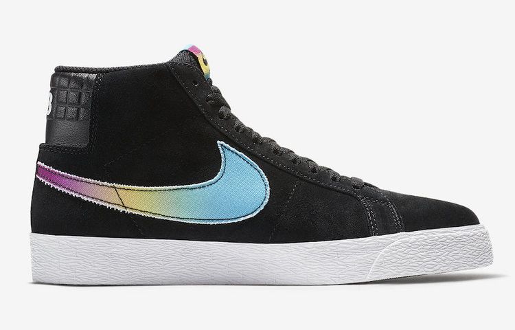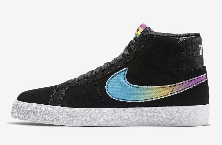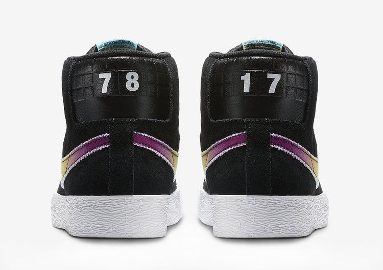 The Nike SB Blazer Zoom Mid "Lance Mountain" features a '70s-era prism-fade upper, inspired by skate culture. Leather heel tiles display "78" and "17," referencing the Blazer's history and future. The font mimics poolside depth markers. Black accents and a Zoom Air-cushioned white vulcanized sole complete the design. Released as a "friends & family" exclusive, it was not sold in stores. Released on {date}, the Nike SB Blazer Zoom Mid "Lance Mountain" is available now at Side Kicks.