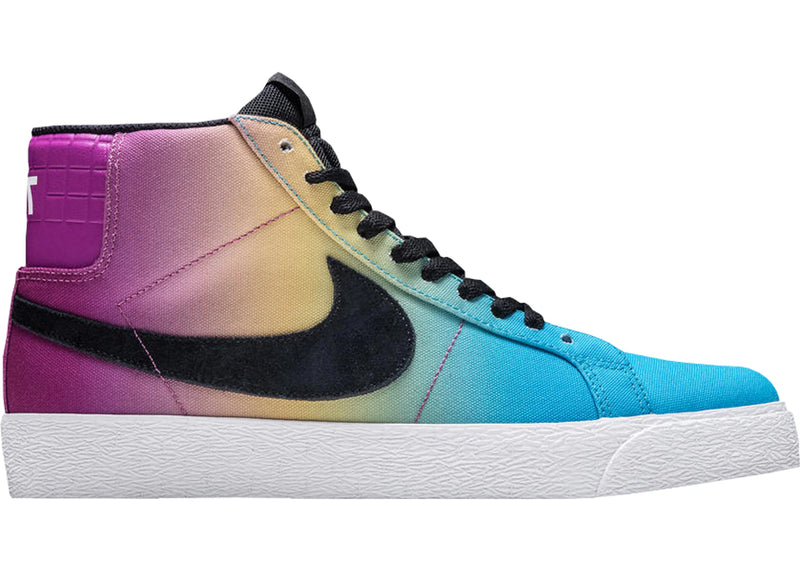 The Nike SB Blazer Zoom Mid "Lance Mountain" features a '70s-inspired prism-fade upper, replacing the original black base. Leather heel tiles display "78" on the left shoe, referencing the Blazer's...