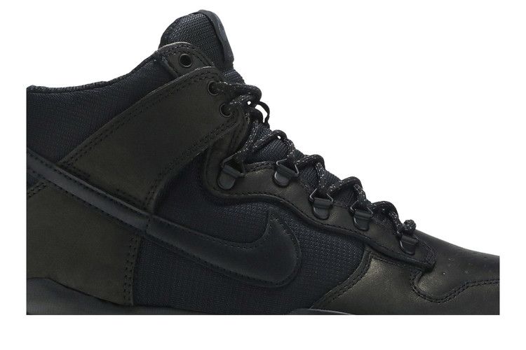 The Nike SB Dunk High Deconstructed Doc Martens features matte black leather with tumbled leather Swooshes on each side. A semi-translucent midsole and outsole pair with gold stitching for a Dr. Martens-inspired look. The design includes a shiny black tongue and exposed padding for a deconstructed finish.