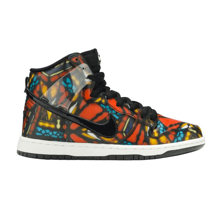 The Nike SB Dunk High Concepts Stained Glass features a Gym Red and black-white color scheme on a high-top silhouette. Its upper combines smooth leather and suede with a stained glass-inspired design for durability and visual appeal. The padded tongue and collar enhance comfort, while the high-top construction provides ankle support. Branding includes lateral Swooshes and a "NIKE Swoosh SB CONCEPTS" tongue inscription. Released on July 25, 2015, the Nike SB Dunk High Concepts Stained Glass is available now at Side Kicks.